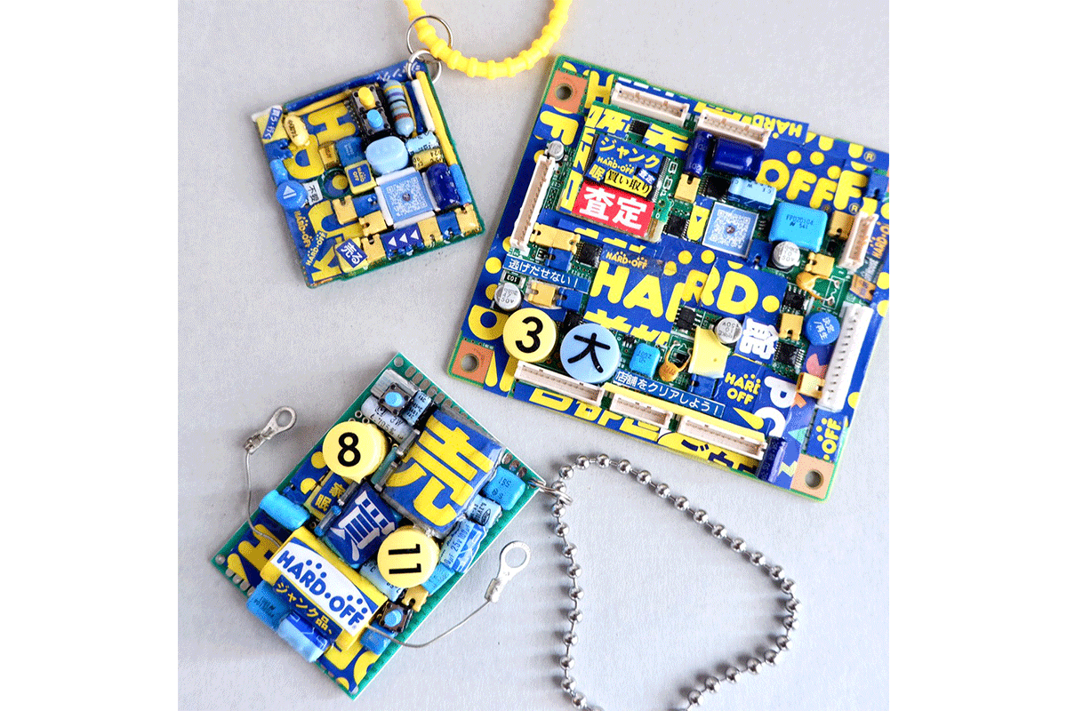 電子部品をアップサイクルして、アート作品や小物を制作しているブランド。今回はHARD OFFのジャンク品を使用して制作した作品も販売します。