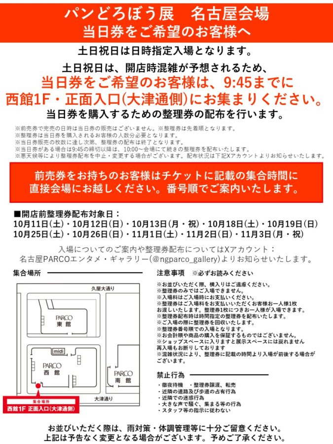 整理券の配布状況は、Xアカウント:名古屋PARCOエンタメ・ギャラリー@ngparco_galleryよりお知らせいたします。