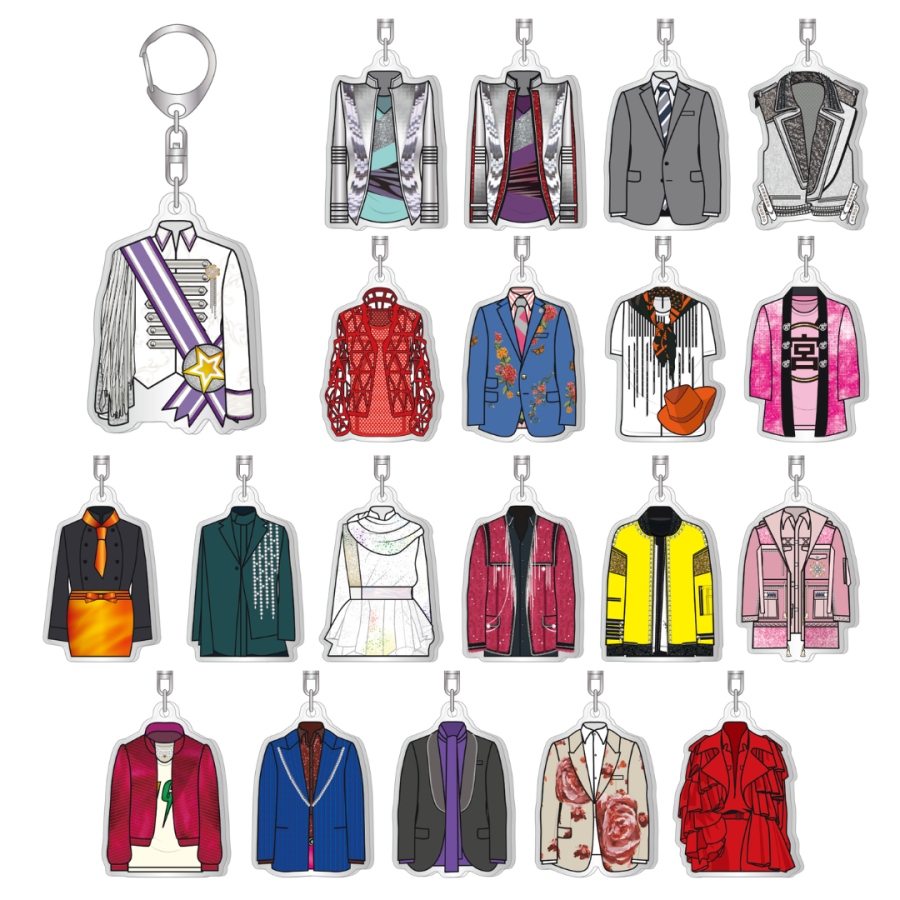 本展開催記念グッズは、 展示コンセプトに合わせて、衣装の素材から発想したディテールがデザインされたステッカーや衣装ルックのキーホルダー、さらに、本展ロゴ入りのハンガー、ハンカチスカーフなどのファッションアイテムのほか、キービジュアル撮影時のアザーカットを使用したカードセットもラインナップ。